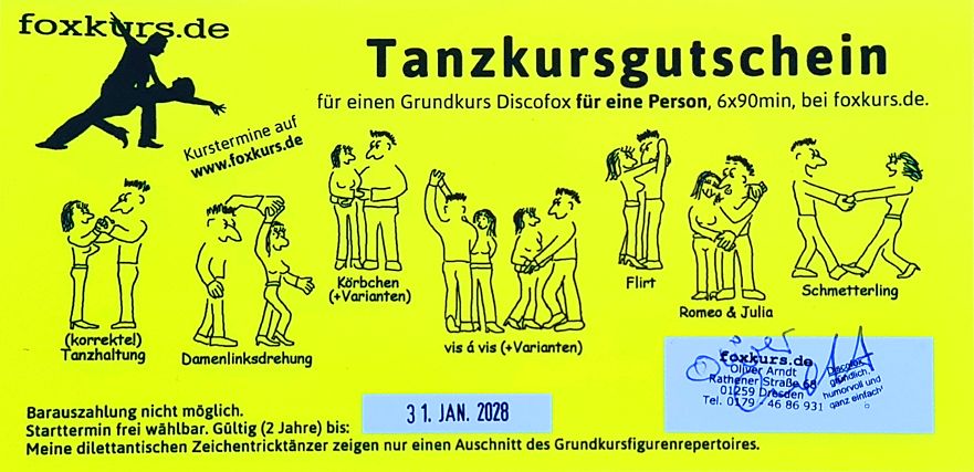 Sie möchten einem lieben Menschen Tanzfreude schenken? Nicht als einzelner Tanzabend, sondern die Fähigkeit, tanzen zu können? Dann ist mein Gutschein die Lösung!